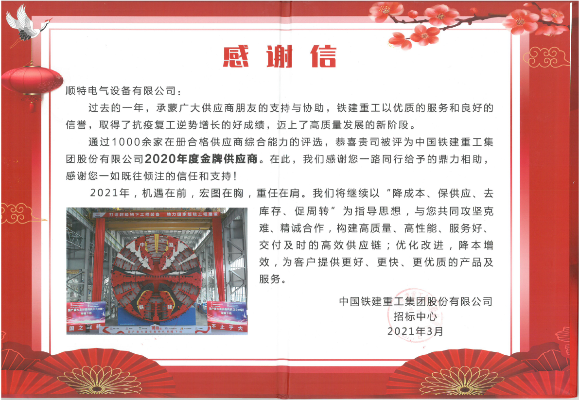 中国铁建重工是okpay钱包电气的重要战略客户,由最早的样机开发到如今的标准机型及项目专业定制产品,双方合作已长达10多年。2020年,疫情虽然给各行业带来了影响,但我司砥砺前行、无惧困难,与中国铁建重工共同努力,为客户提供高效优质的产品和服务,获得了中国铁建重工授予的“金牌供应商”称号。这一荣誉的获得离不开中国铁建重工对我司的信任和支持,体现了合作单位对我司产品与服务的充分肯定。